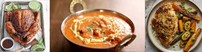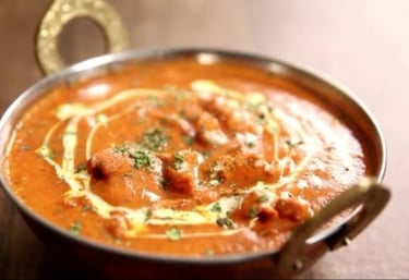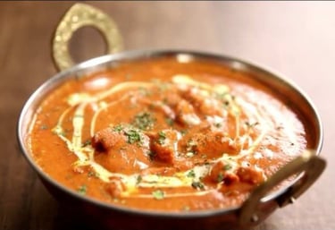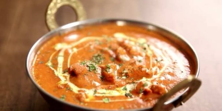 Butter Chicken with Garlic Naan – tender chicken simmered in a spiced tomato-cream sauce, served with basmati rice and warm naan.